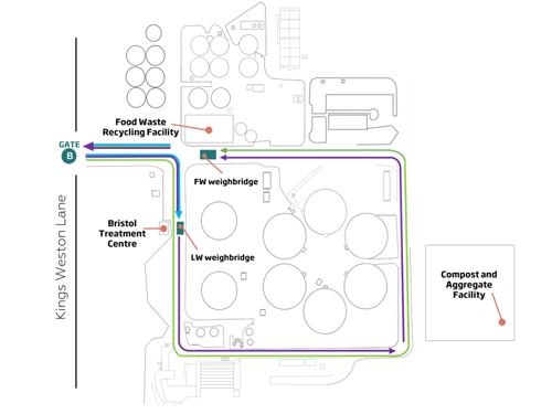 Head to the LW weighbridge. Wait for the green light and collect your ticket at the cabin. Make your way around site to the Compost and Aggregates Facility. After finishing the collection/delivery, travel anti-clockwise to the FW weighbridge to book out.